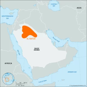 The Nafud Desert, also known as the An Nafud or the Great Nafud, is a vast sand desert located in the northern part of the Arabian Peninsula, covering parts of Saudi Arabia. Here’s an overview of the Nafud Desert: